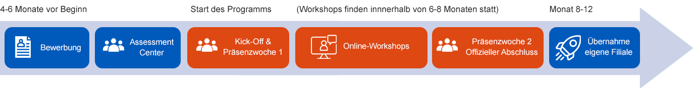 Welche Workshops dich erwarten, findest du unter dem Punkt „Das erwartet dich“. Neben vielen Workshops und Trainings, erarbeitest du während deiner Zeit in der Filiale an Praxisbausteinen, die dich auf deine zukünftige Tätigkeit als Filialleitung vorbereiten.